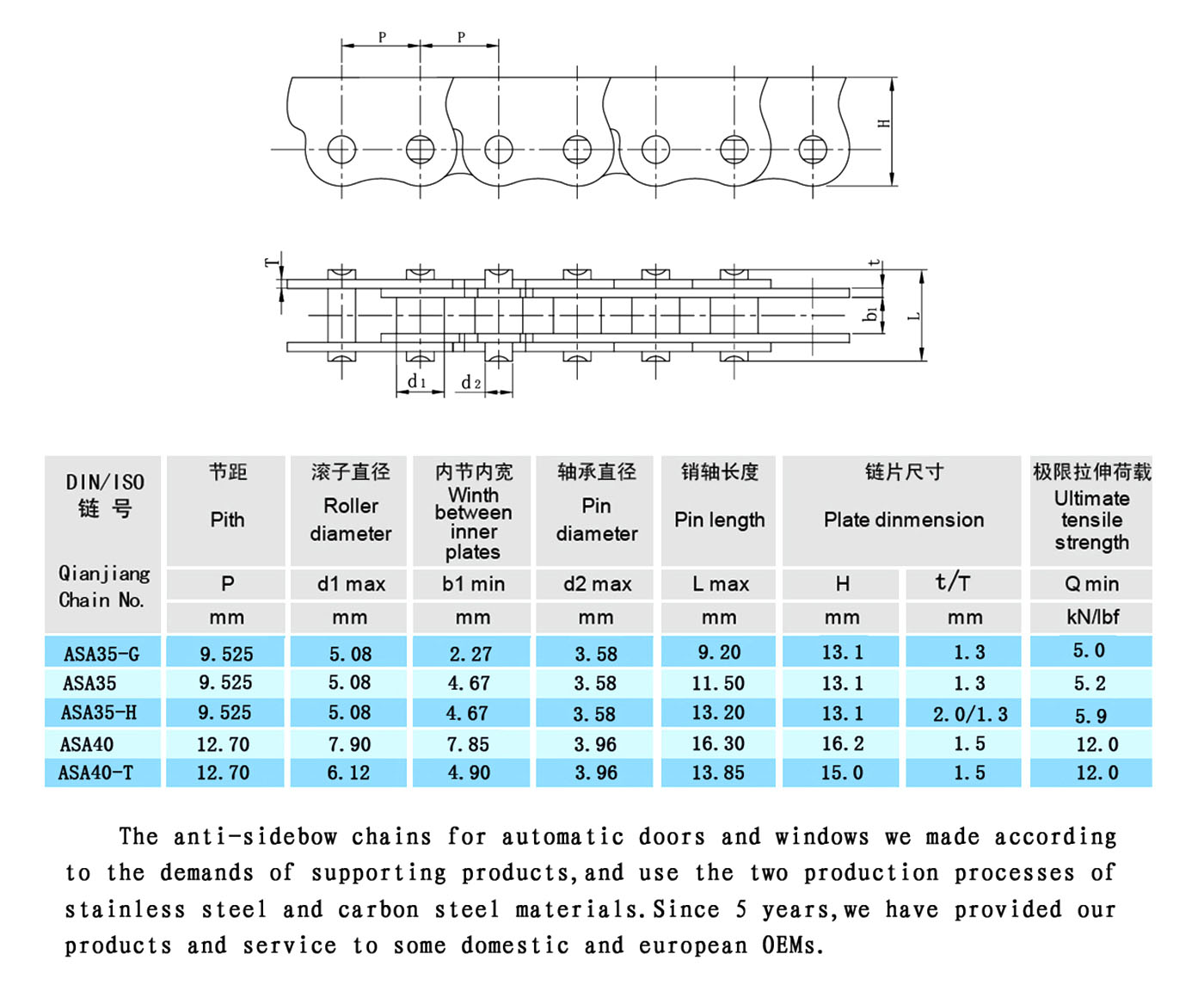 বুদ্ধিমান দরজা এবং উইন্ডো অ্যান্টি-বেন্ডিং চেইনটি উপরের ঝুলন্ত উইন্ডো, ভিতরের উল্টানো উইন্ডো, বাইরের উল্টানো উইন্ডো, কেসড উইন্ডো, ফ্ল্যাট পুশ উইন্ডো, স্কাইলাইট এবং এর মতো প্রয়োগ করা যেতে পারে। বৈদ্যুতিক দ্বারা চালিত. চেইনটি উচ্চ-মানের ইস্পাত এবং দস্তা-নিকেল খাদ পৃষ্ঠের অ্যান্টি-জারা শক্তিশালীকরণ প্রক্রিয়ার সাথে চিকিত্সা করা হয় এবং লবণ স্প্রে পরীক্ষা 150 ঘন্টা পৌঁছায়। এটা বড় ধাক্কা-টান বল, কম শব্দ এবং ভাল স্থায়িত্ব বৈশিষ্ট্য আছে.
