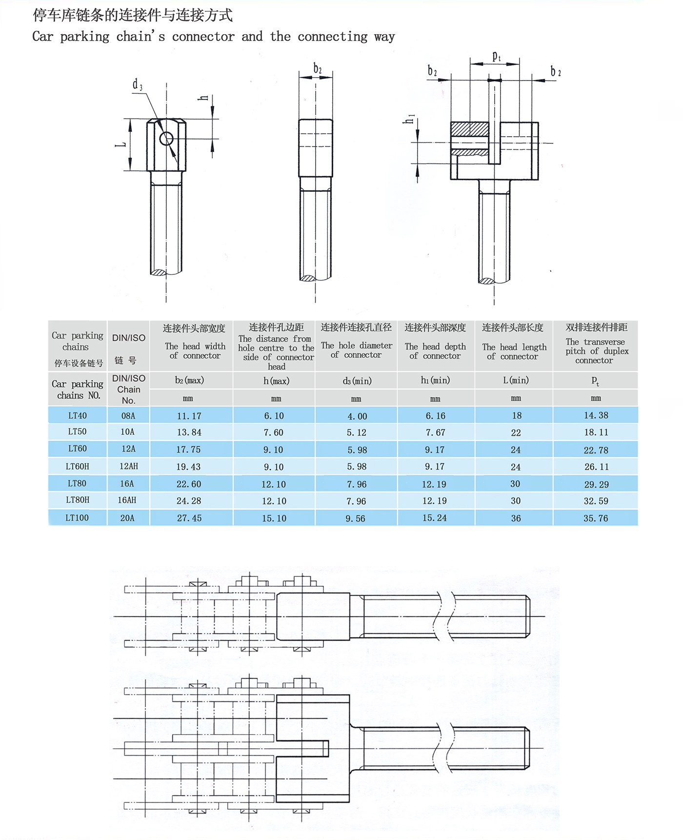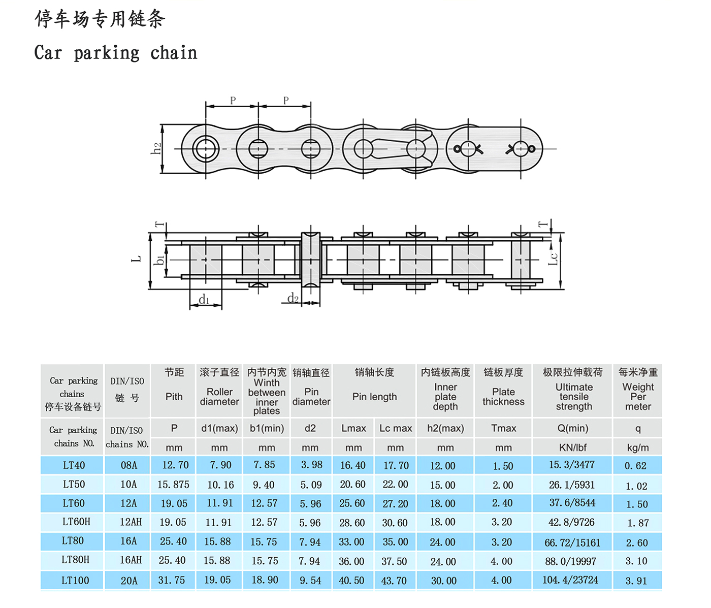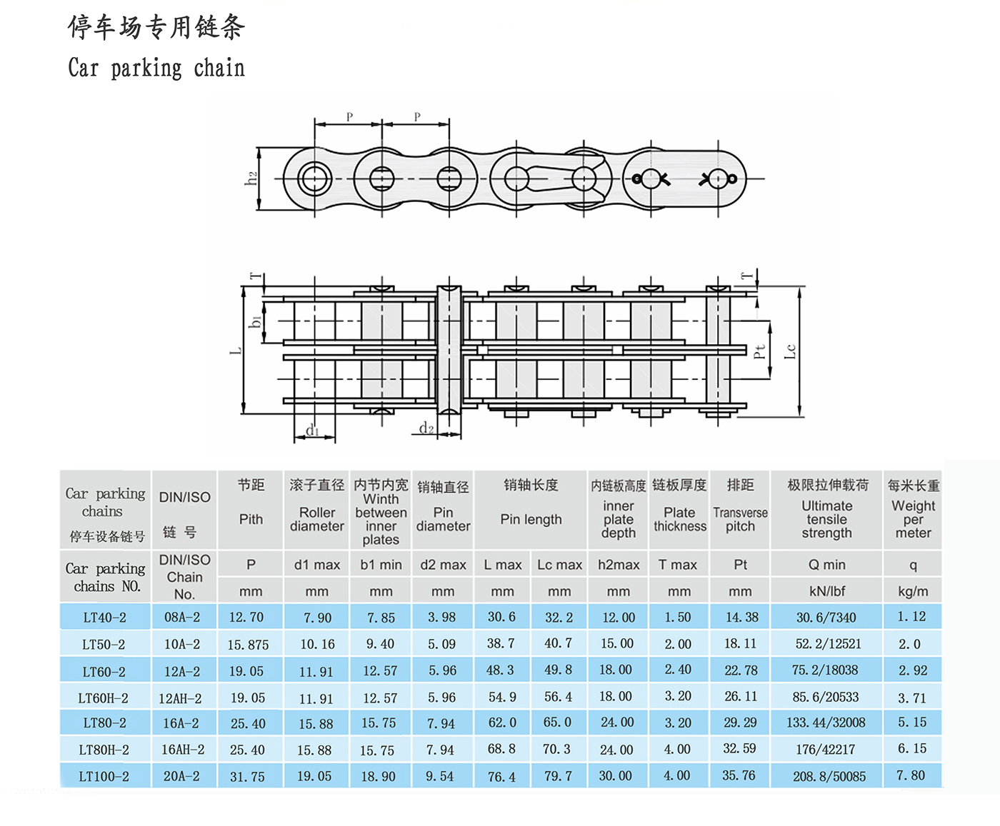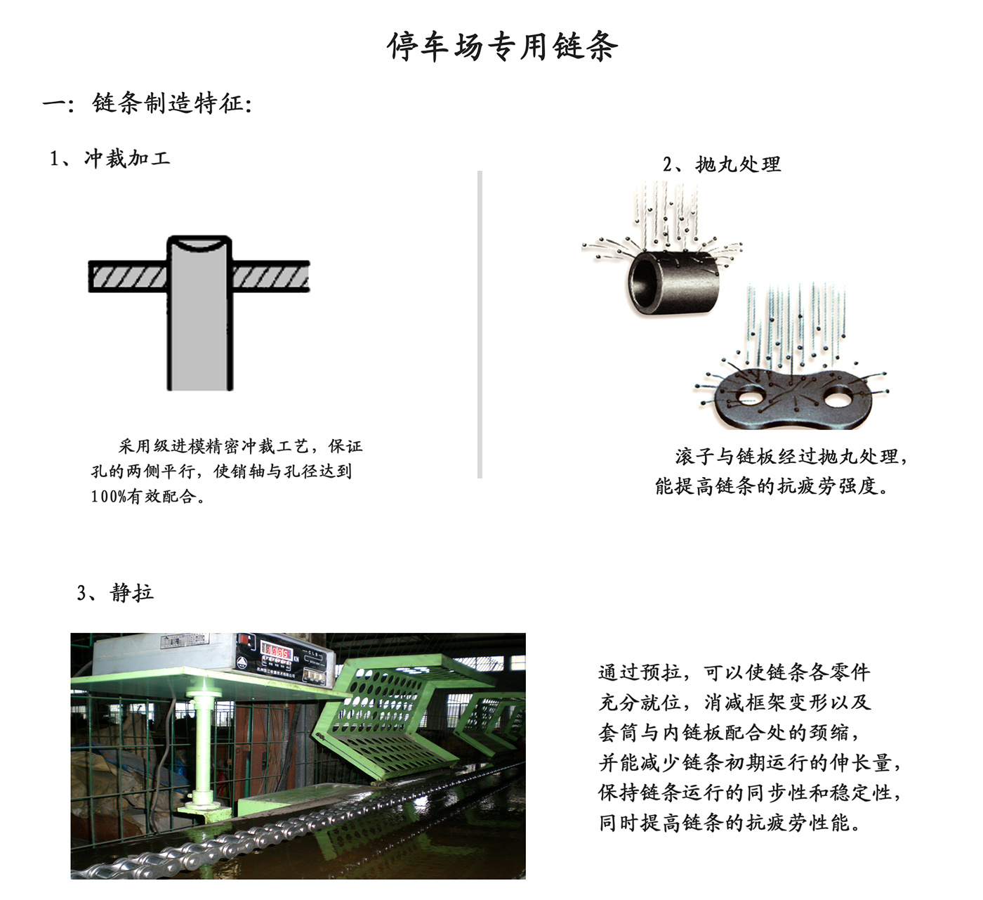 বুদ্ধিমান ত্রি-মাত্রিক পার্কিং লট সরঞ্জামের চেইনটি পার্কিং সরঞ্জামের প্রধান অংশের দ্বিতীয় পর্যায়ের সংক্রমণ। বাস্তবায়নের মান হল JB/T11079-2011। চেইনের ব্যবহারের বৈশিষ্ট্য: বড় বহন ক্ষমতা, উচ্চ প্রসার্য শক্তি (স্ট্যাটিক শক্তি), ন্যূনতম প্রসার্য শক্তি সাধারণ নির্ভুল রোলার চেইনের চেয়ে 10% -30% বেশি, বিকৃতির সূচক, চেইন দৈর্ঘ্যের নির্ভুলতা, ক্লান্তি প্রতিরোধ ইত্যাদিও সাধারণ সূক্ষ্মতা রোলারের চেয়ে বেশি।