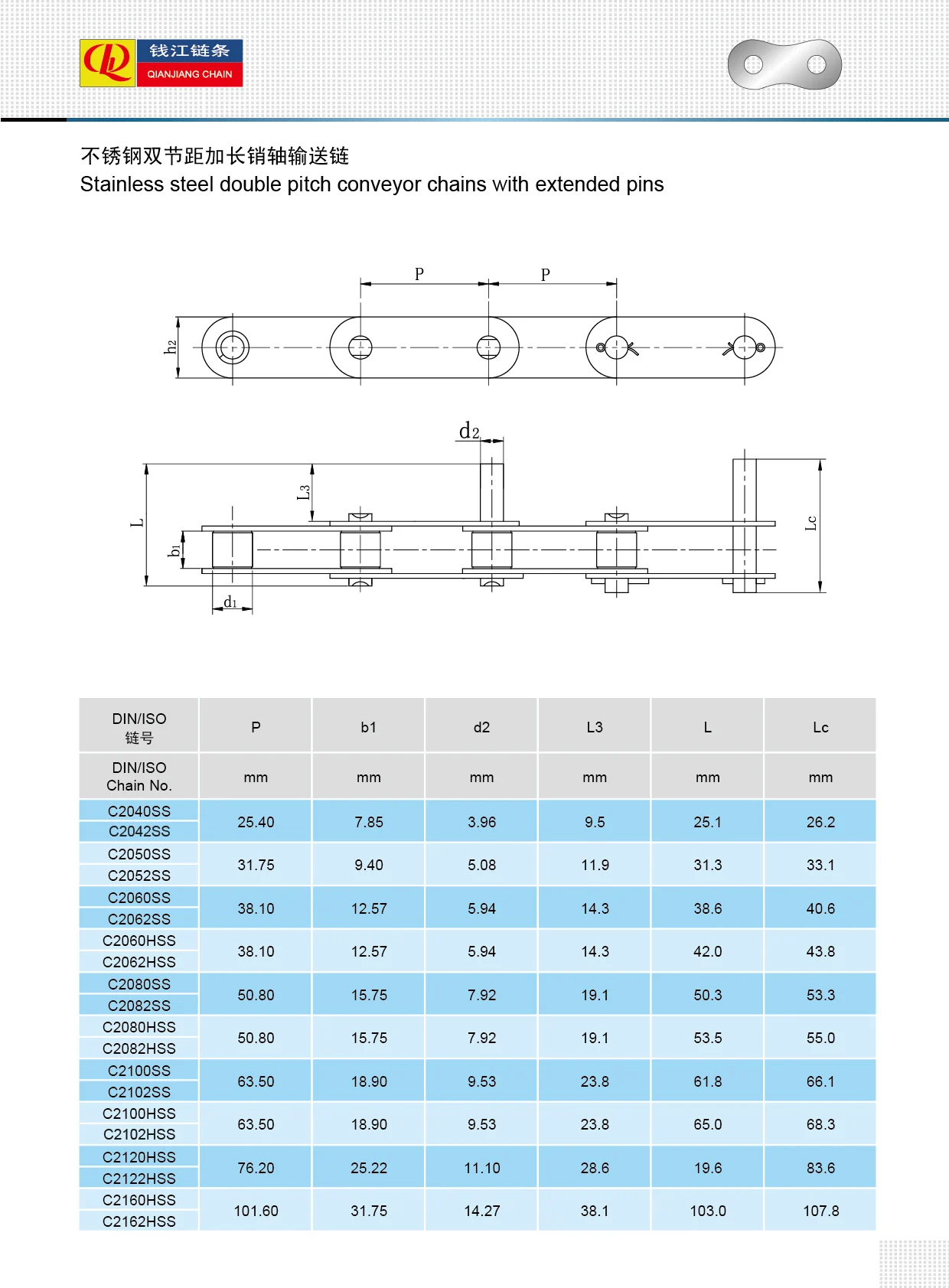 বর্ধিত পিন সহ স্টেইনলেস স্টীল ডবল পিচ পরিবাহক চেইন
